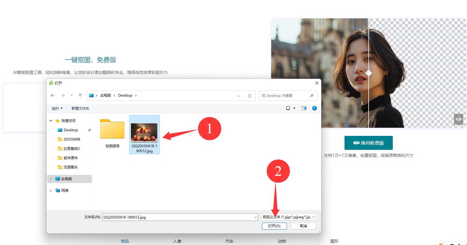 翰墨ai抠图网页版提供免费在线智能一键抠图去除背景变透明底功能,只需要将原图素材上传到翰墨AI网站平台,将全自动把图案中的主体部分抠出来,边沿细节达到像素级的剥离,直接可以告别PS软件这些繁琐又需要技术基础的传统操作方式,大大提高工作效率。