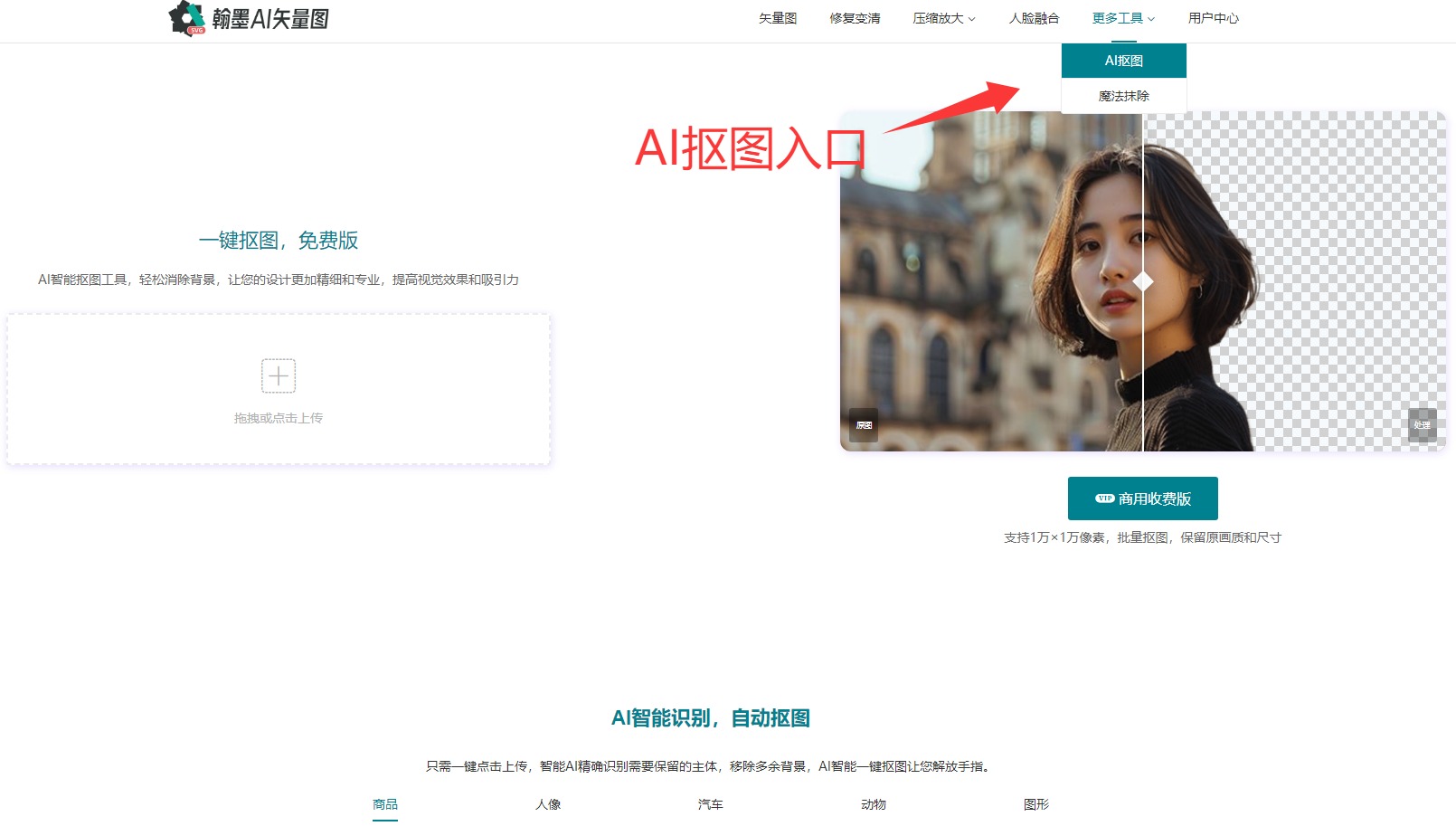 登录翰墨ai图片处理工具网址后点击导航上的“更多工具”下拉出来的“AI抠图”点击即可打开如下图所示页面,只需要在该页面上传需要抠出透明底的原始图片即可;