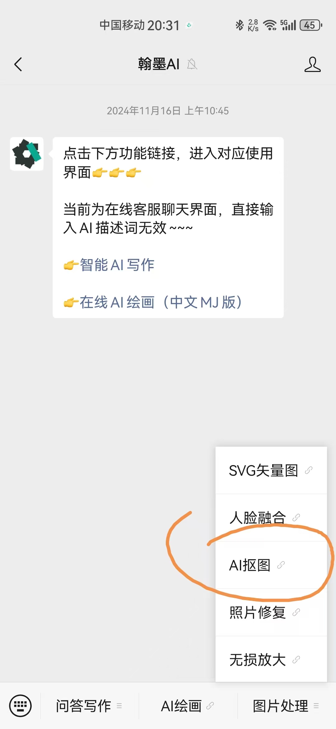 手机端因为涉及到用户没法直接使用微信扫描二维码登录,所以在搜索引擎登录翰墨AI一律跳转到公众号使用,我们登录了公众号之后只需要在底部导航位置点击“图片处理”即可看到如下图所示的AI抠图入口方式了,通过公众号进入则自动完成了登录授权,可以直接使用。