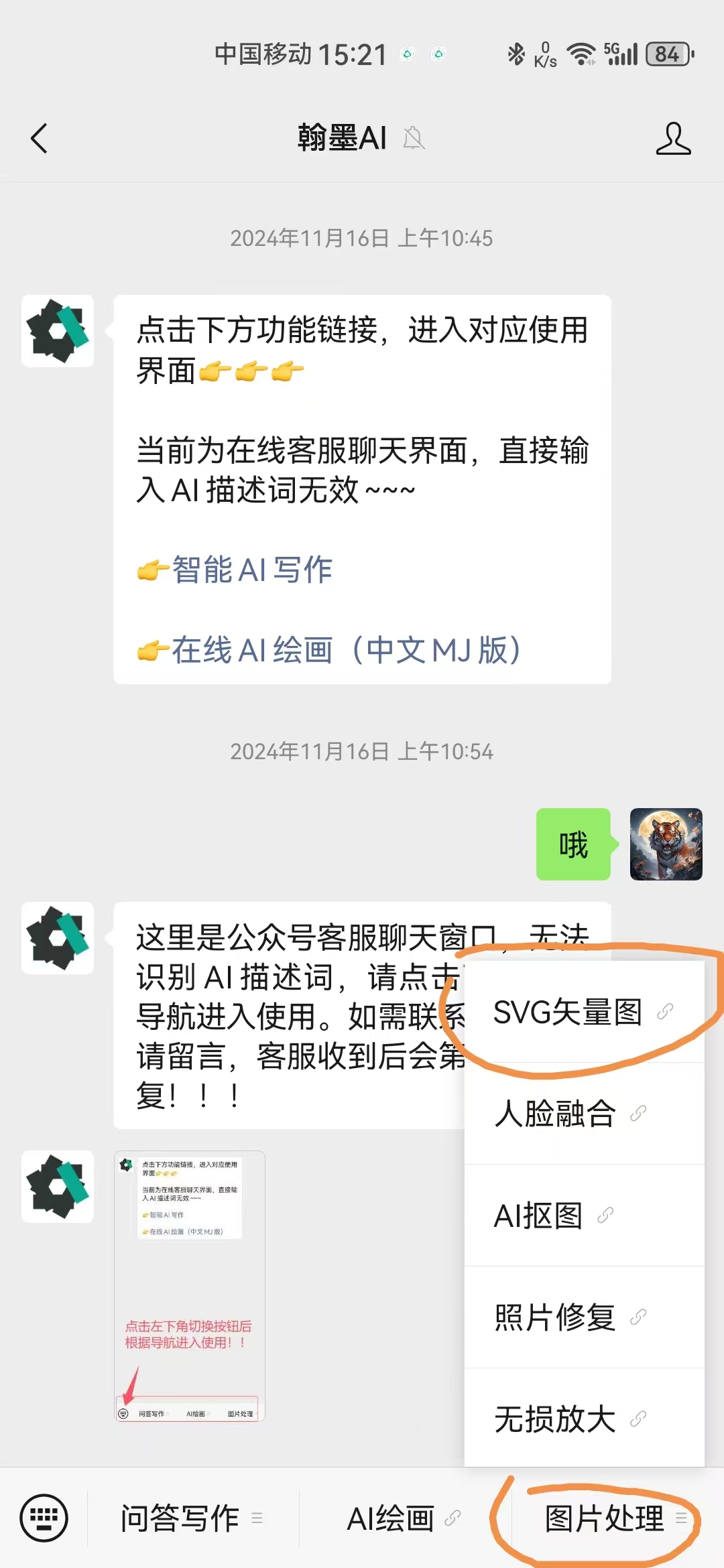 至于手机端如何进入到公众号可以根据网站上的个人中心引导下到达,同时你可以直接在微信上搜索“翰墨AI”关注后也是可以正常使用的。