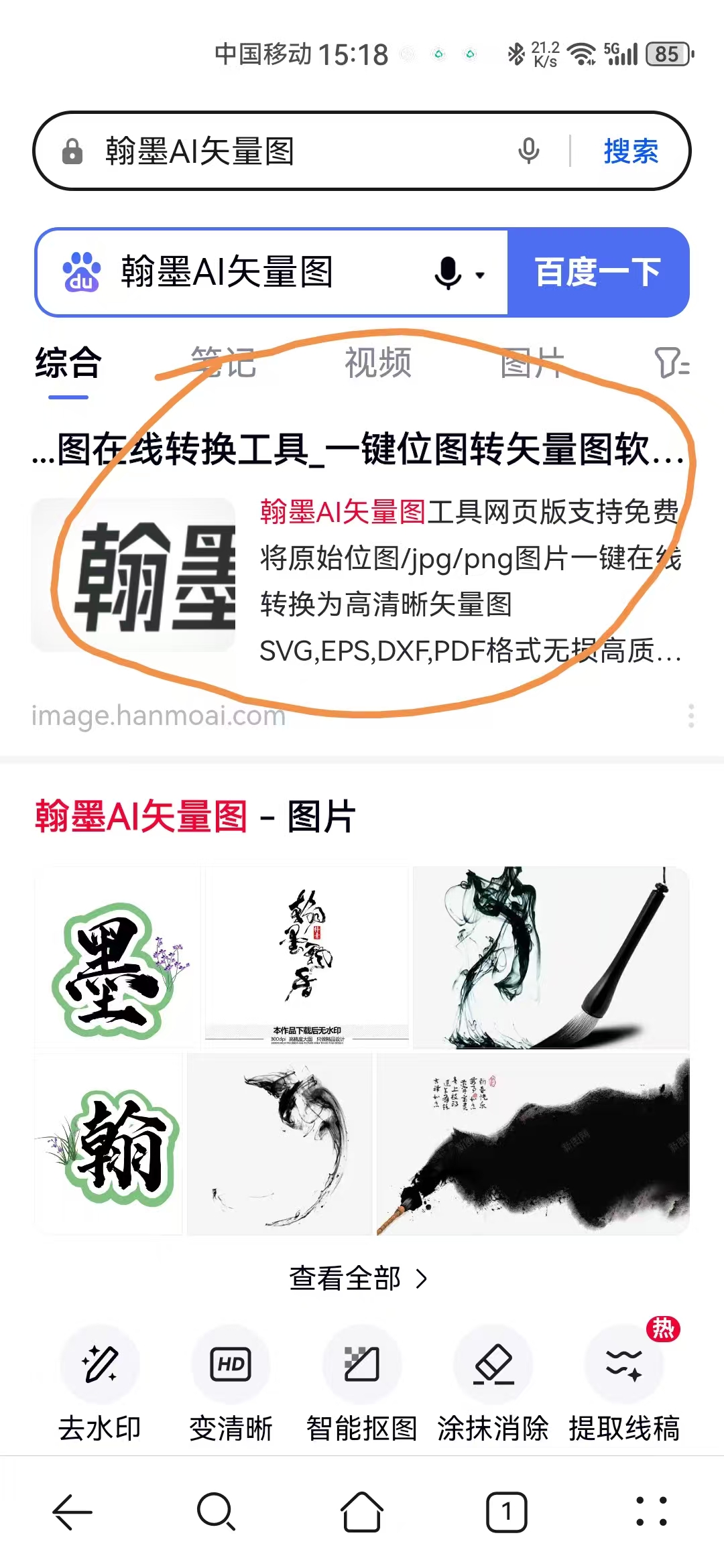 2.翰墨AI矢量图工具移动手机端使用方法:在手机上的搜索引擎输入“翰墨AI矢量图”找到我们网站后先进行登录,此处需要注意的是因为移动网页搜索引擎无法直接微信扫码进行登录,需要跳转到我们翰墨AI公众号内再进行使用。