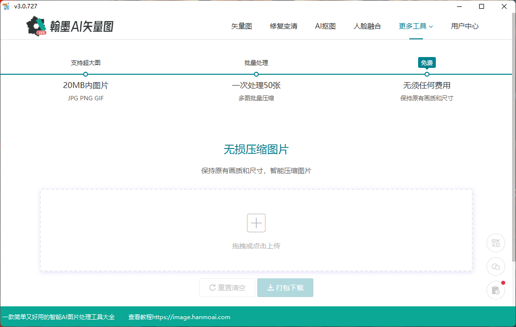 支持最大20MB内JPG、PNG、GIF图片在线进行压缩处理,无损化输出后依然保持原有画质和尺寸,智能压缩图片。同时也是支撑剂单次最多50张批量化压缩图片。