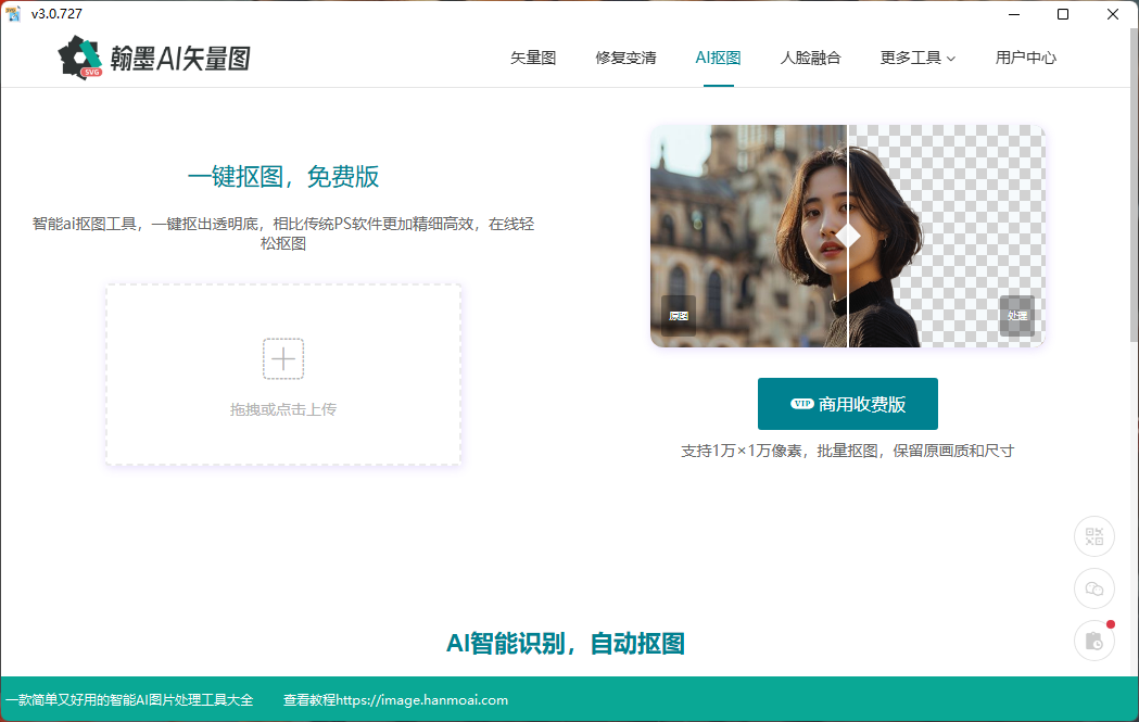 智能ai抠图工具,一键抠出透明底,相比传统PS软件更加精细高效,在线轻松抠图。支持1万×1万像素,批量抠图,保留原画质和尺寸。