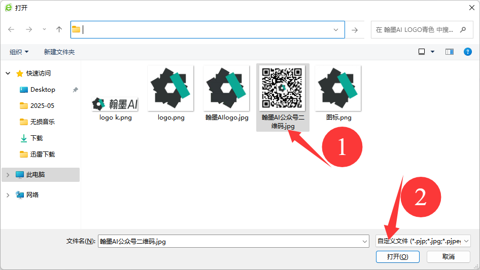 然后上传需要转换矢量图格式的二维码图片,具体操作步骤如下图所示,选择本地文件夹的图片后点击打开上传确认即可;