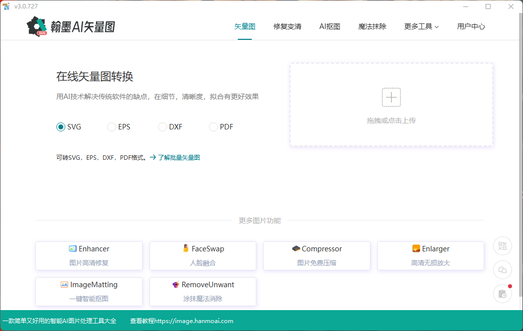 翰墨ai矢量图转换器支持上传jpg、png位图转换出SVG,EPS,DXF,PDF四种格式,满足各种行业以及多个软件平台兼容,转换处理的矢量图格式都支持修改和编辑,一个平台可以解决各种矢量图格式的需求;