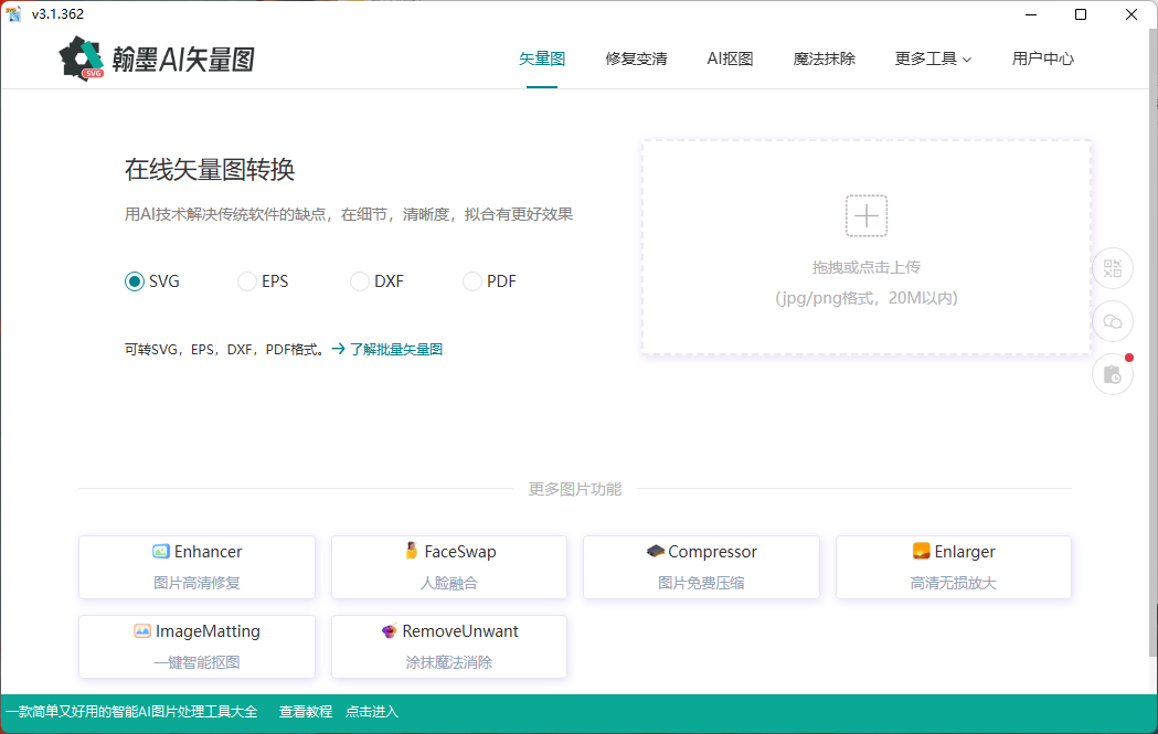 翰墨AI矢量图转换器软件借助人工智能技术发展而来,具备简单高效远比传统依赖设计人员经验更加稳定标准,是现阶段设计行业必备的一款多功能图片处理软件,同时支持网页版使用。它最核心的就是图片转矢量图技术,上传jpg或者png格式的位图即可在线转换生成多种格式的矢量化文件,大大提升设计领域的工作效率以及降低出错率。