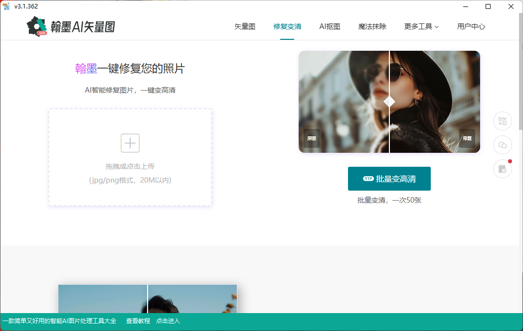 基于深度学习模型,专门优化人像与场景照片。可自动识别并修复面部、衣物、背景等细节,轻松处理褪色老照片、模糊人像、过度曝光或光线不足的图像,一键还原真实画面并提升分辨率。