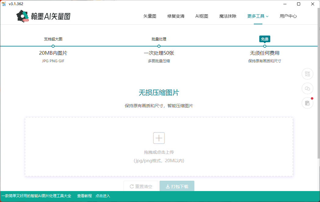 支持在线压缩JPG、PNG、GIF格式图片,最大可处理20MB文件。在压缩同时保持画质与尺寸不受损,同样支持批量处理,单次最多50张。