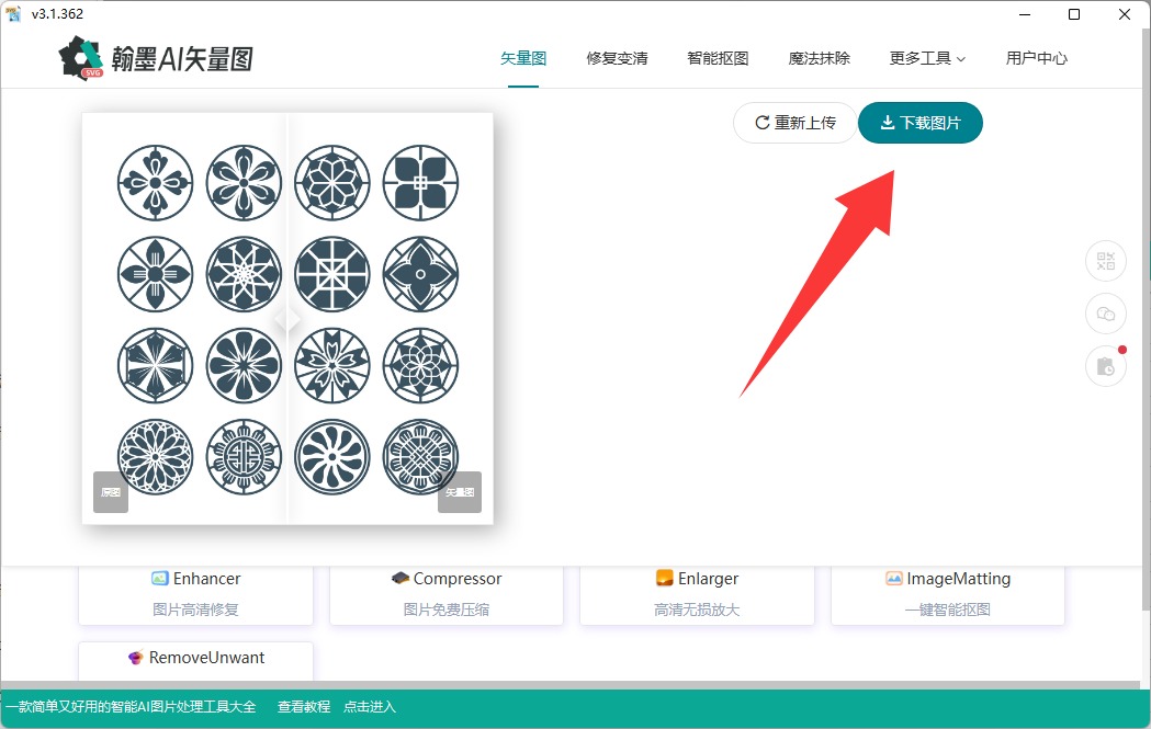 第二步、翰墨AI矢量图生成器自动识别上传的jpg图片,然后进行自动转换dxf格式中,请勿关闭或者刷新