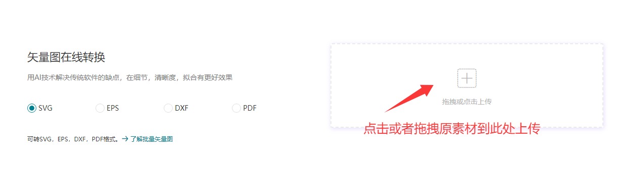 第一步、打开翰墨ai矢量图网站首页,在下图所示的右上角“+”号位置上传jpg/png等常规格式素材,且文件大小不超过10M;支持生成svg/eps/dxf/pdf四种矢量图输出格式,默认选择svg即可;